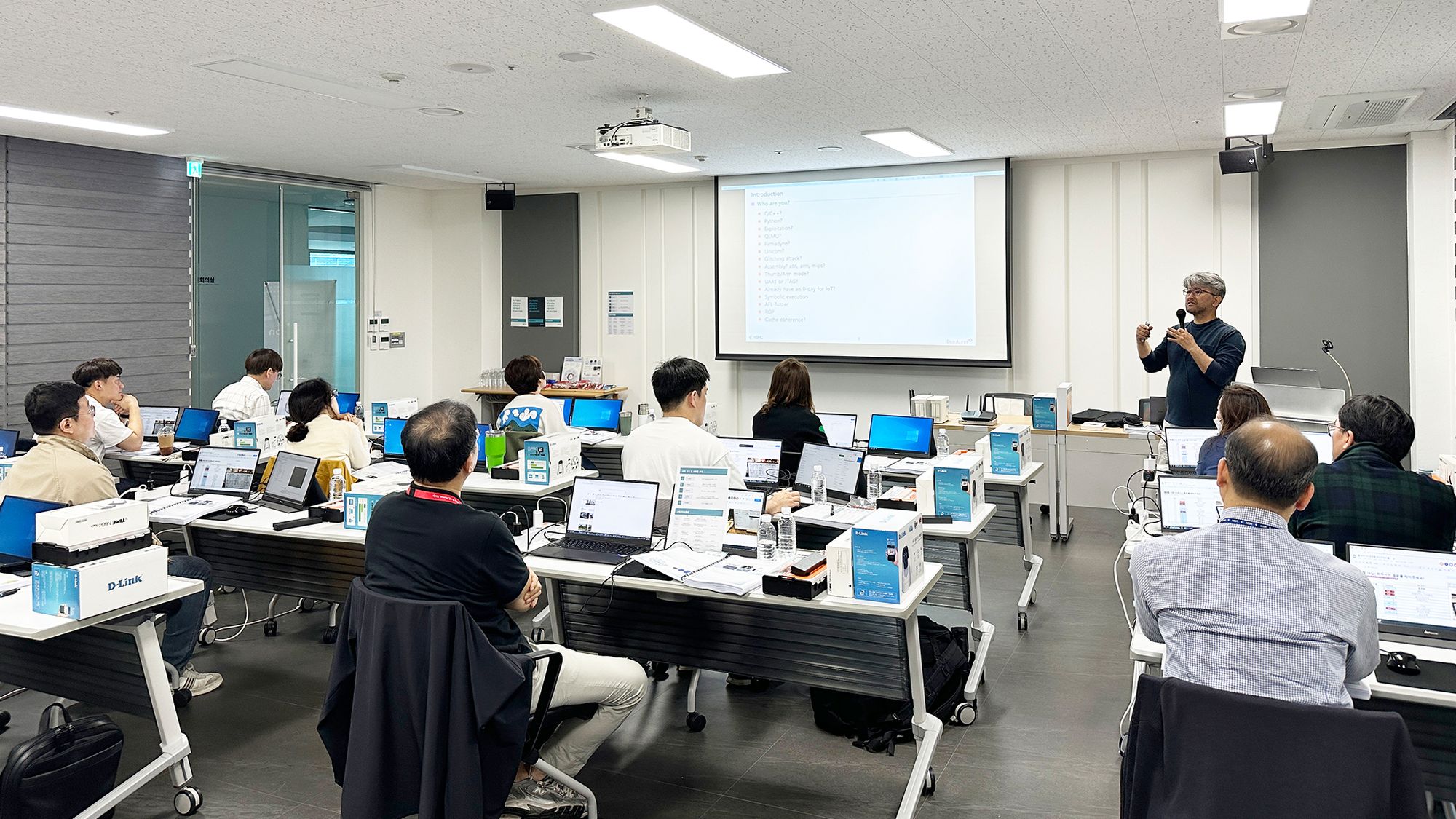 A 기관에서의 3일은 IoT 기기의 펌웨어를 추출하고, 디버깅 및 분석하며 우리 삶 곳곳에 이용되고 있는 IoT 기기들이 얼마나 취약한지 배울 수 있는 시간이 되었습니다. 14분의 정보보안 담당 실무진들께서는 반짝이는 눈빛을 가지고 IoT Exploitation 교육에 임해주셨습니다. 덕분에 NSHC 보안 교육 강사진도 더욱 더 힘을 얻어 더 많은 정보를 전달해 드릴 수 있었답니다.